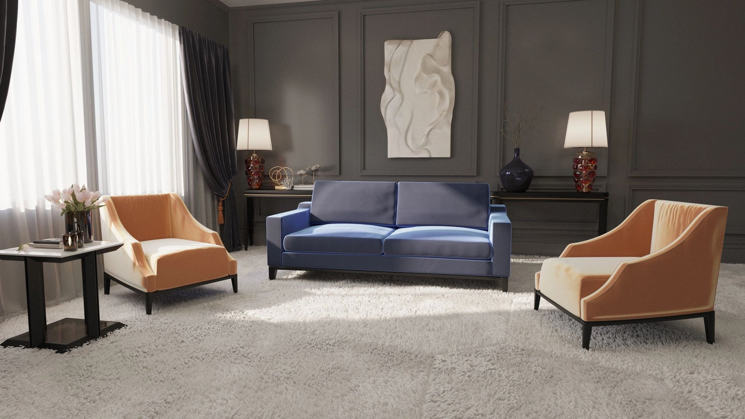 This living room is designed to exude a sense of elegance and comfort, with a color palette centered around deep blue, amber, and contrasting light .