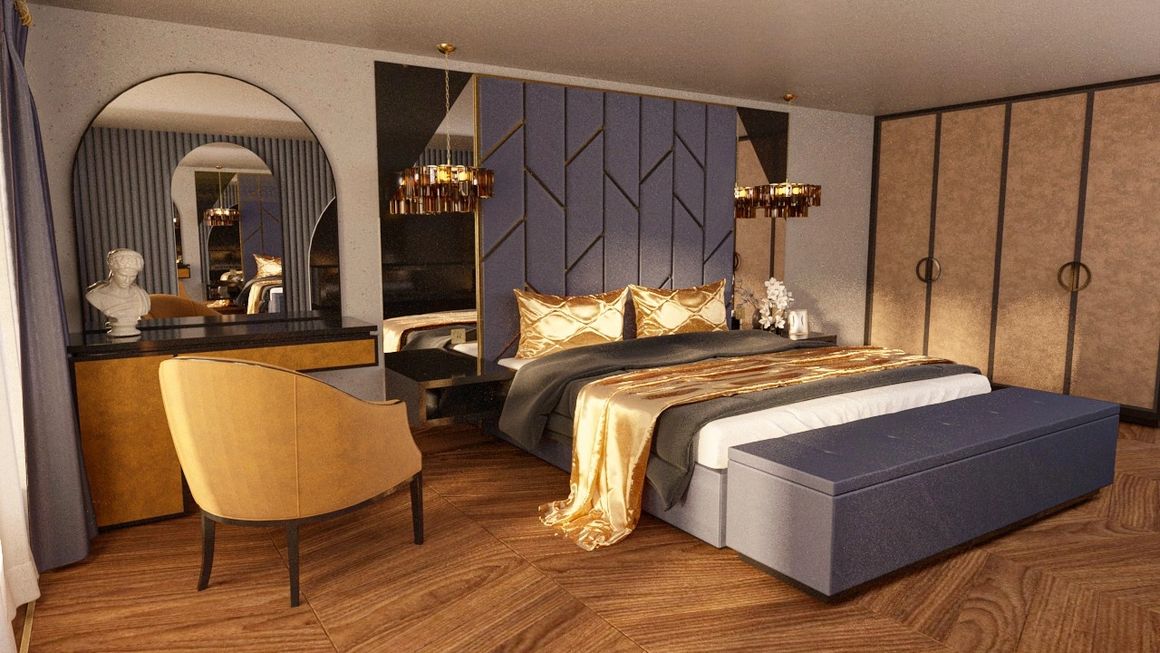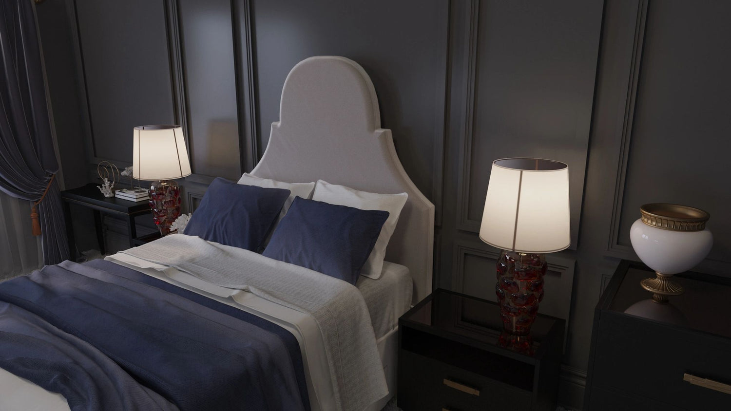 The bedroom features a sophisticated and contemporary design with graphite paneling walls that create a sleek and luxurious atmosphere. The dark gray tone of the walls provides a neutral backdrop that allows the other elements to stand out. The headboard is upholstered in a luxurious fabric, such as linen or velvet, in a soft and light shade. Its design is clean and minimalistic, exuding an air of understated elegance.