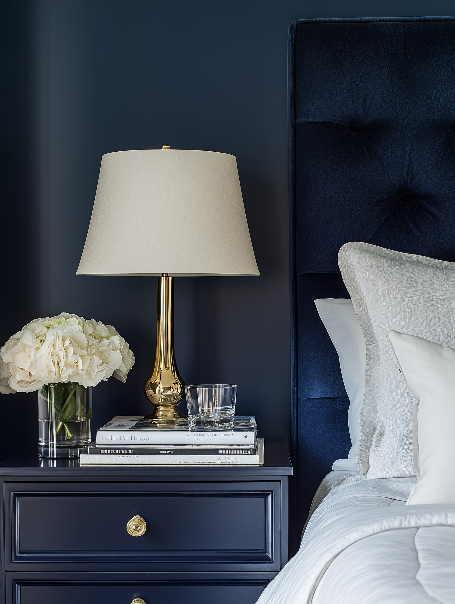 Experience the understated sophistication of the Edinburgh Elegance Project, a bedroom design that combines deep, moody hues with luxurious textures. The centerpiece is the plush, tufted headboard in midnight blue, paired beautifully with bespoke cabinetry featuring gold accents. Soft white linens and a touch of greenery bring balance and warmth, while curated accessories, including a statement lamp and elegant decor, complete the look. This space is designed to evoke a sense of calm and timeless refinement, perfect for restful nights and peaceful mornings.